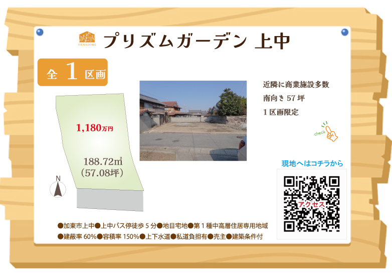 また、南向きで57坪あり、平屋や1.5階建ての建築も可能です。プランは自由設計ですので、一からお客様の希望を形にしていきます。